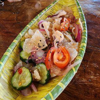 紅藜白飯在手,指尖上的筷子猶豫著該往哪一道下手才好。配色亮麗好看的涼拌花枝海蜇皮,爽口入味;魚卵香腸和鹹豬肉切盤,搭配泡了甜酸的醋水蒜片,格外豐富口感;伴隨著蒜香的炒野菜,昭和草為主、佛手瓜、南瓜和紅蘿蔔切片襯色添美,清新自然,青菜香氣在咀嚼後自動綻放;著火上桌的醬味九孔,有著烤肉的樂趣;帶有藥膳味的鮮蝦野菜湯,別有一番滋味。