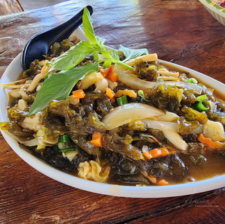「雨來菇」顧名思義為雨天過後才出現在鄉間溝渠草地的野菜,雖名有菇但實為陸生藍綠藻,口感脆嫩接近木耳,營養價值非常高。它和「情人的眼淚」會有連結,來自於一對戀人因父母反對私奔,最終力氣放盡、相擁逝去的阿美族傳說,這對戀人最後的眼淚落地之處長出雨來菇,為此而有了淒美的命名。眼前這道有勾芡的「情人的眼淚」,洋蔥與醬油大火熱炒後的鹹香,大幅拉近與「餓」的距離,雨來菇的滑順、蛋香四溢再加上烏醋助陣,微鹹微酸是嘴裡滿意的合奏曲,同時間腦裡浮現出應對故事的苦楚,喝了一口微甜的洛神花冰飲後嘆氣,是感嘆故事殘缺的結局,也是對菜餚滿足的表示。